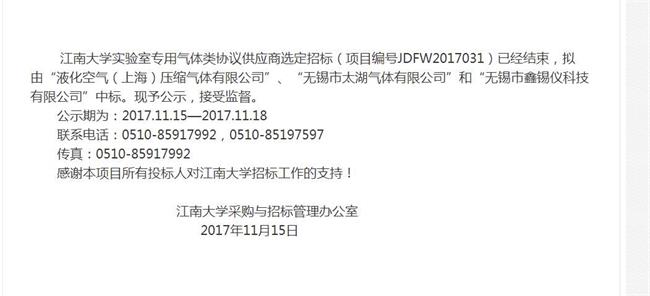 江南大學(xué)實驗室專用氣體類協(xié)議供應(yīng)商選定招標(項目編號:JDFW2017031)已結(jié)束,熱烈慶祝鑫錫儀中標成為江南大學(xué)氣體供應(yīng)商!